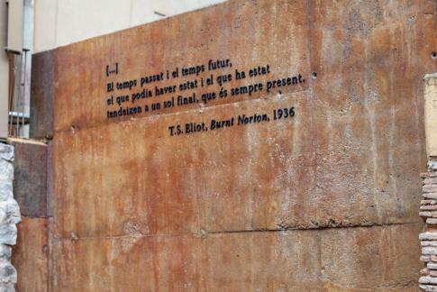 Text: „El temps passat i el temps futur, / el que podia haver estat i el que ha estat / tendeixen a un sol final, que és sempre present. // T. S. Eliot: Burnt Norton [Four Quartets], 1936“.