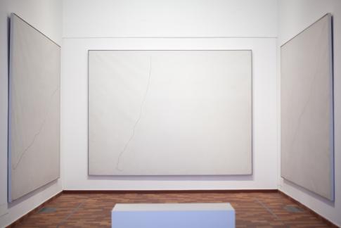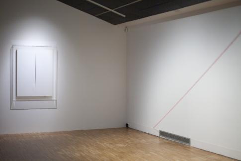 (Links:) Lucio Fontana: Concetto spaziale. Attesa. Acrílic sobre tela, 1960. Museo Nacional Centro de Arte Reina Sofía, Madrid. (Rechts:) Fred Sandback: Untitled (Diagonal Construction). Detail, fil acrílic de color borgonya, 1970/2002. Fred Sandback Estate, cortesia de Galería Cayón, Madrid et al.
