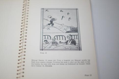 Text: „Manuel Garcia, 12 years old. From a hospital cot, Manuel recalls his flight from enemy planes. Covering his eyes to shut out of sight of falling bombs, he runs with dogs and sheep as frightened as himself. Children’s Colony 10, Alicante.“