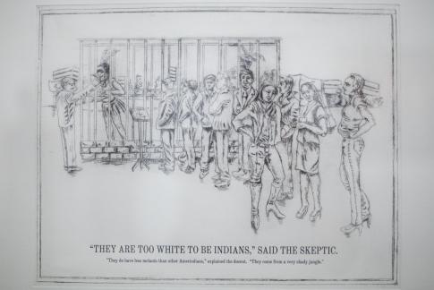 Text: „‚They ‚are too white to be Indians,‘ said the skeptic. ‚They do have less melanin than other Amerindians,‘ explained the docent. ‚They come from a very shady jungle.‘“
