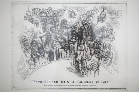 Text: „‚If People thought you were real, didn’t you fail?‘ asked the noted conceptual artist to the Guatinaui female upon completion of her lecture.“