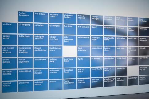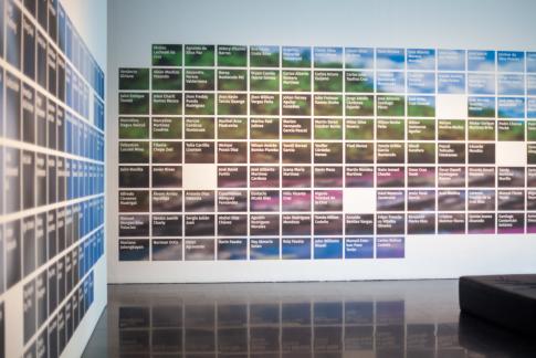 Coco Fusco in collaboration with Loid Der: Journalists Killed at Work Around the World, 2023–24/2025. Assassinated Environmental Activists Around the World, 2023/2025. Artists in Prison Worldwide, 2024/2025. Detail, impressió per raig de tinta sobre paper. Cortesia de l’artista i de Mendes Wood DM São Paulo et al.