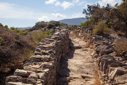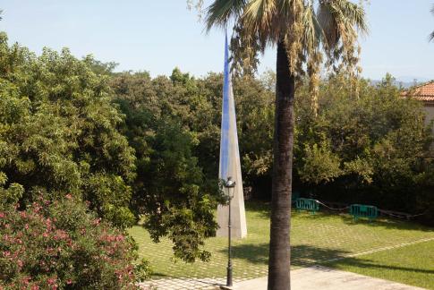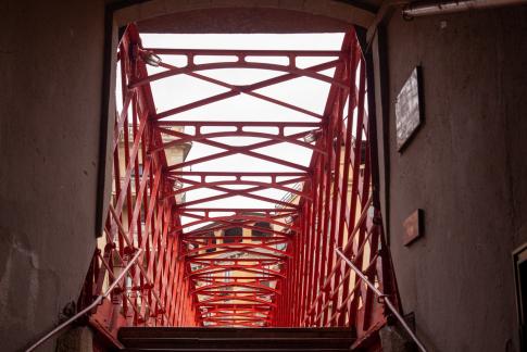 Text: „Rhythm, communication, transit / rush, movement, work, history… a way / to connect and live. // Trodden passage, where neither one vehicle / nor an animal have passed through. // In the memory lives nothing but the / footprints of thousands of anonymous people / that were crossing it for a long time. // A new period begins where new footprints / are about to be printed, from new people and / new traditions, but the old ones will / be preserved and seen if you look up in the sky. // A bet for the future footprints that are / starting to pass through.“