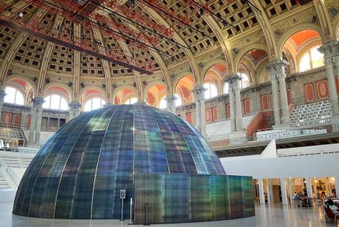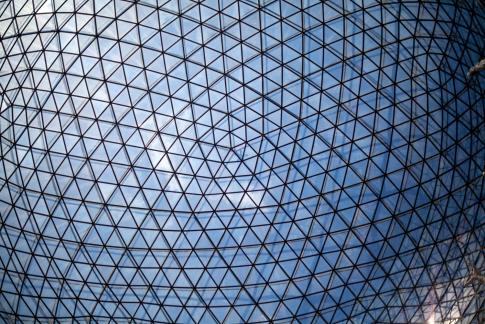 Mit geodätischer Kuppel (sphärische Kuppel mit Gitterschale aus Dreiecken) von Richard Buckminster Fuller.