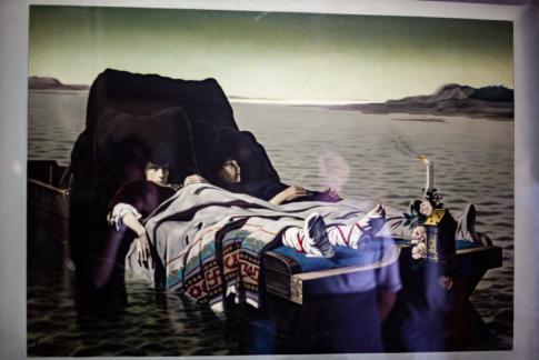 (Unten:) Die nackte Gala betrachtet das Meer, das sich in einer Entfernung von achtzehn Metern in das Bildnis von Abraham Lincoln verwandelt. 420x318cm, Öl auf Fotografie, 1975.