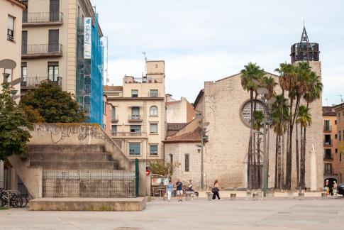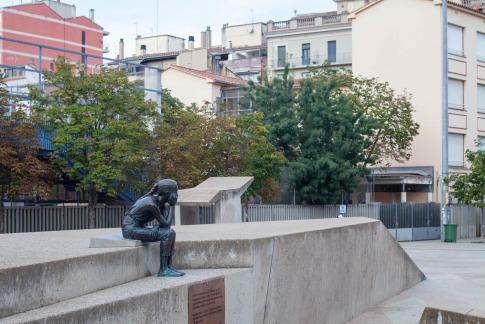 Zum Park wird auf dem Schild darunter auf das Unabhängigkeitsreferendum 2017 verwiesen, Text: „During the referendum held on 1st October 2017, the citizens of Girona were brutally assaulted by the Spanish security forces while freely and peacefully exercising their right to vote. // This square is intended to be a testimony of admiration and remembrance to the people’s dignified behaviour and courage. Ajuntament de Girona“.