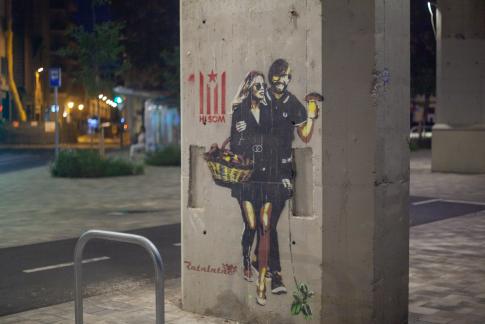 „Hi Som“, wir sind hier, könnte mit dem Fußballclub von Girona in Zusammenhang stehen – und vielleicht unabhängig von dem Pilze sammelnden Paar sein, das ein Hündchen von Jeff Koons an der Leine führt.