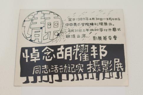Einladung zur Ausstellung dokumentarischer Fotografien zum Gedenken an Genosse Hu Yaobang. 15x18,5cm, Siebdruck auf Papier, 1989. Courtesy Wang Youshen.