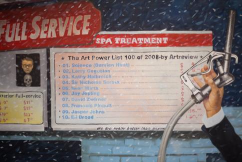 Text: „Full Service / Spa Treatment // The Art Power List 100 of 2008, by Artreview // 01. Science (Damien Hirst) / 02. Larry Gagosian / 03. Kathy Halbreich / 04. Sir Nicholas Serota / 05. Iwan Wirth / 06. Jay Jopling / 07. David Zwirner / 08. Francois Pinault / 09. Jasper Johns / 10. Eli Broad // We are really better than anyone“.