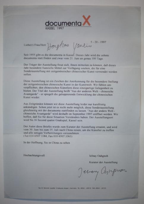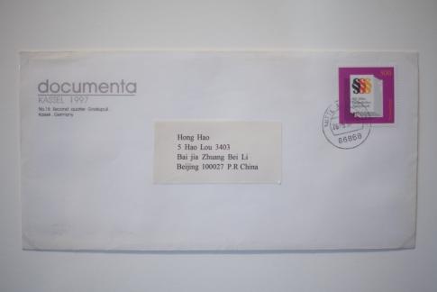 Hong Hao 洪浩 (*1965), Yan Lei 颜磊 (*1965): Invitation Letter to documenta Kassel. (Hier im Bild:) 29,7x21,7cm, gedruckter Brief, (s. u.:) 11x22,1cm, gestempelter Briefumschlag, 1997. Courtesy Hong Hao, Yan Lei.