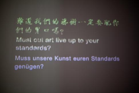 Text: „难道我们的艺术——是安慰你们的胃口吗? | Muss unsere Kunst euren Standards genügen?“