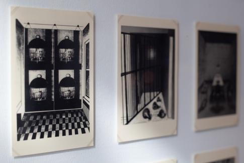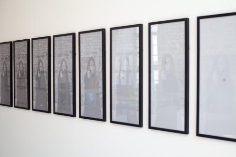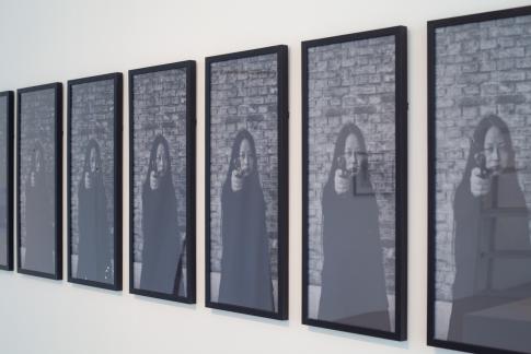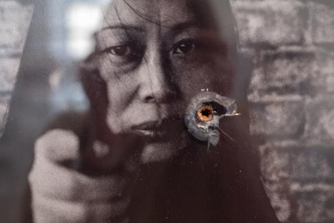 Xiao Lu 肖鲁 (*1962): 15 Gunshots…From 1989 to 2003. Detail, je 100x45x5cm, 15 Schwarzweiz-Digitaldrucke, gerahmt, Einschussloch, 2003. Courtesy Xiao Lu.